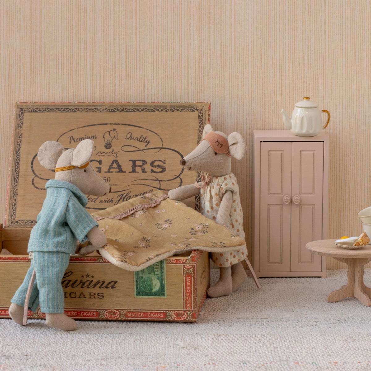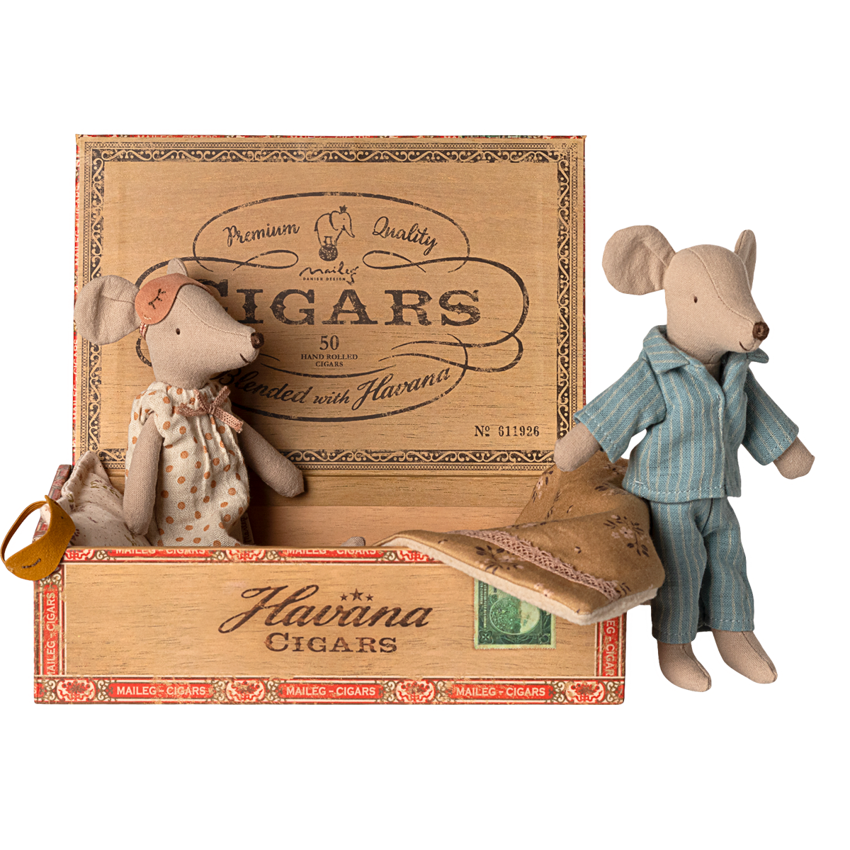 Suchst Du nach einem zeitlosen Spielzeug für Deine Kinder? Die Maileg Mäuse Mama und Papa sind ein absoluter Klassiker in der Welt der dänischen Stofftiere. Das Set bringt den Charme vergangener Zeiten direkt in Dein Kinderzimmer, da die Mäuse in einer nostalgischen Zigarrenkiste schlafen. Beide Figuren tragen wunderschöne Nachtwäsche und niedliche Augenmasken für eine ungestörte Nachtruhe. Weil die Details so liebevoll gestaltet sind, werden diese Mäuse schnell zu den besten Freunden Deiner Kleinen. So wird jede Spielstunde zu einer Reise in eine fantasievolle Welt voller kleiner Abenteuer.